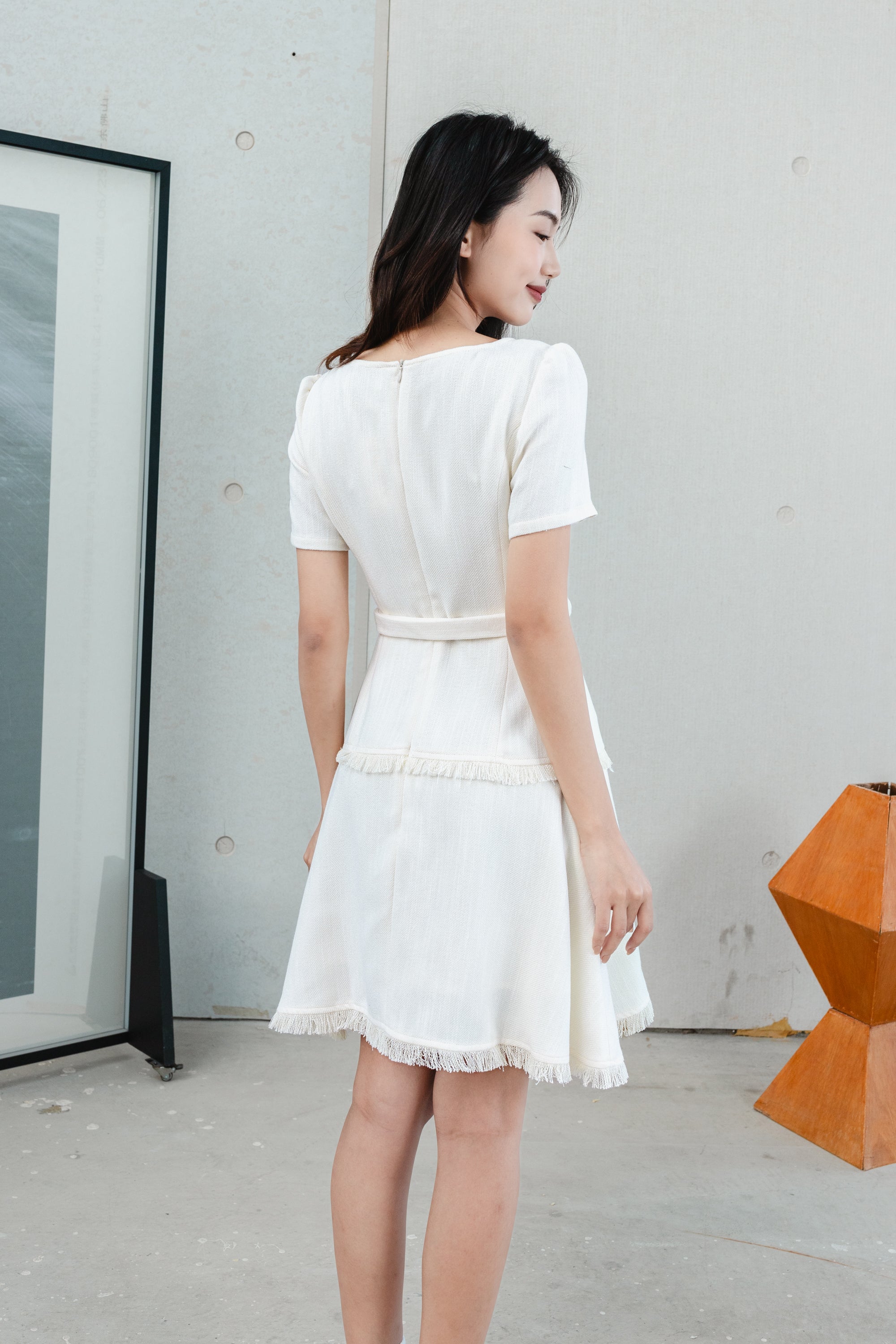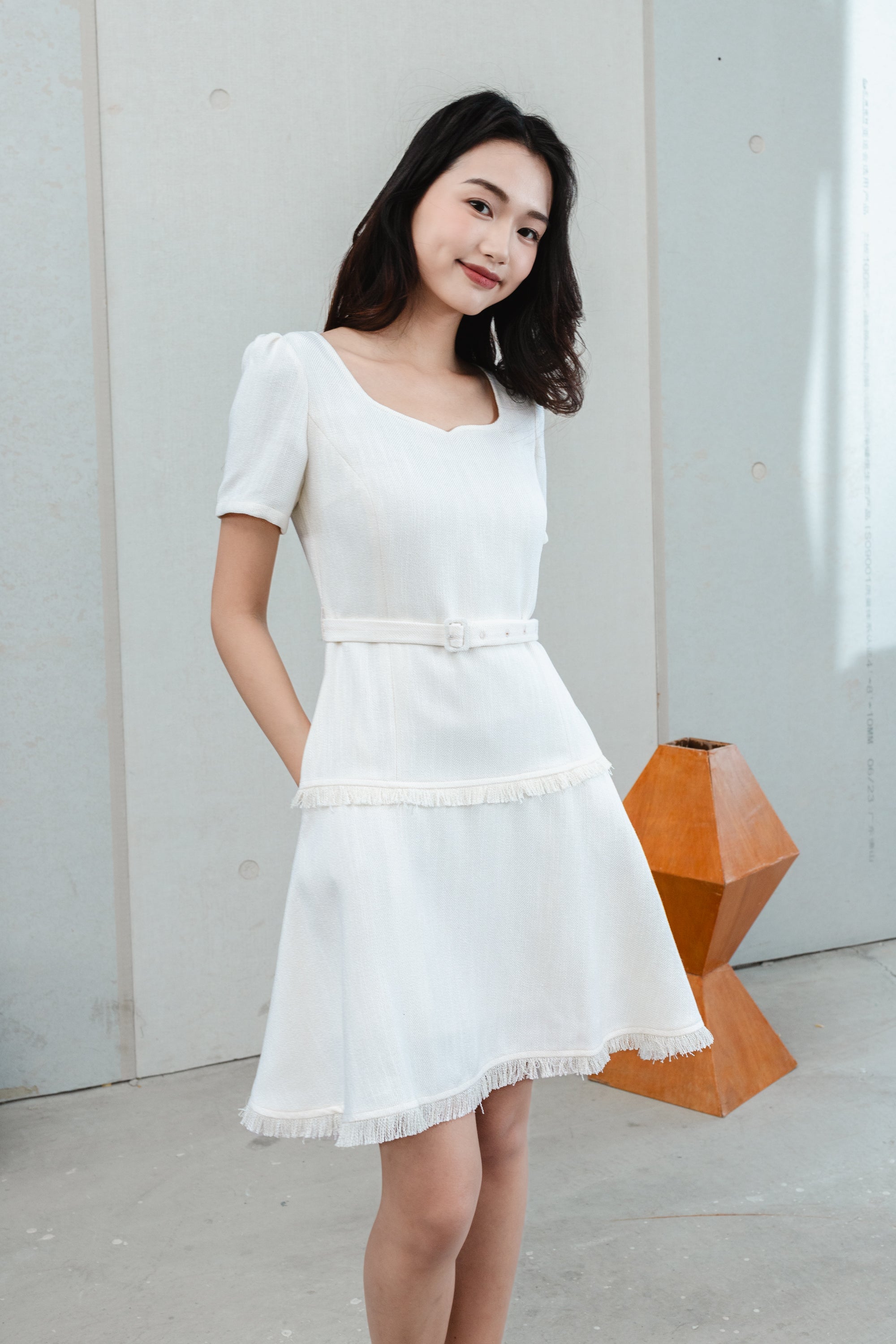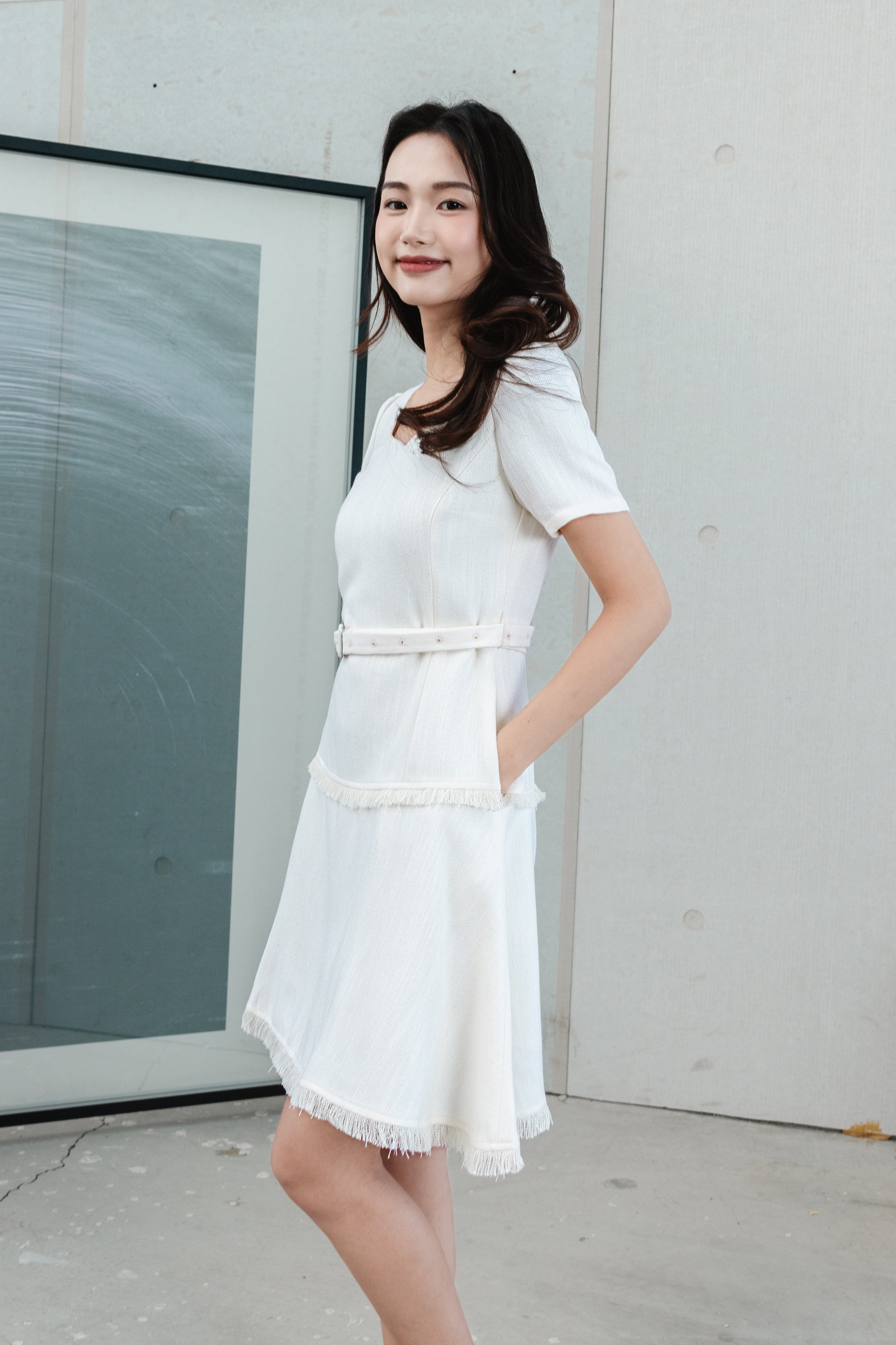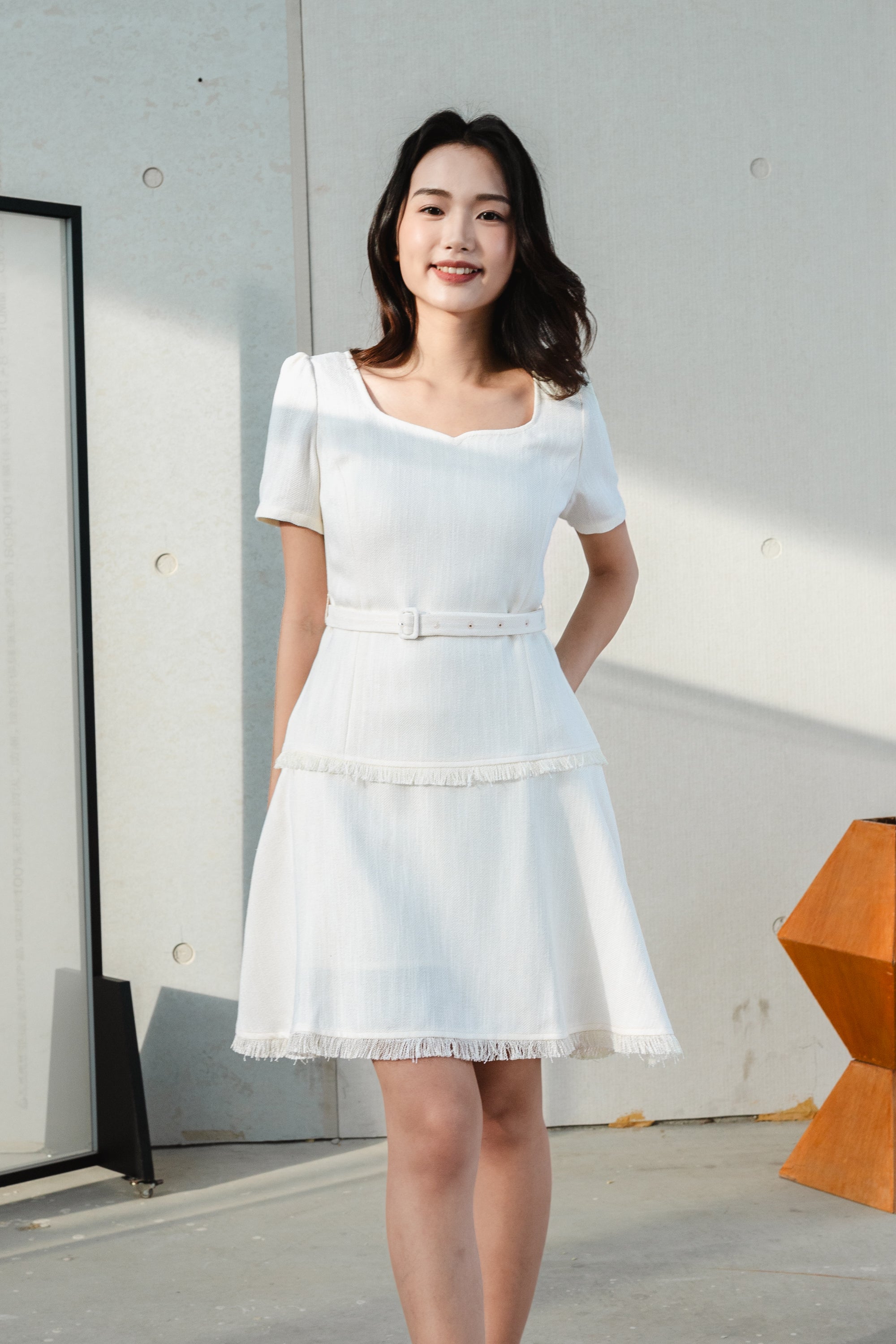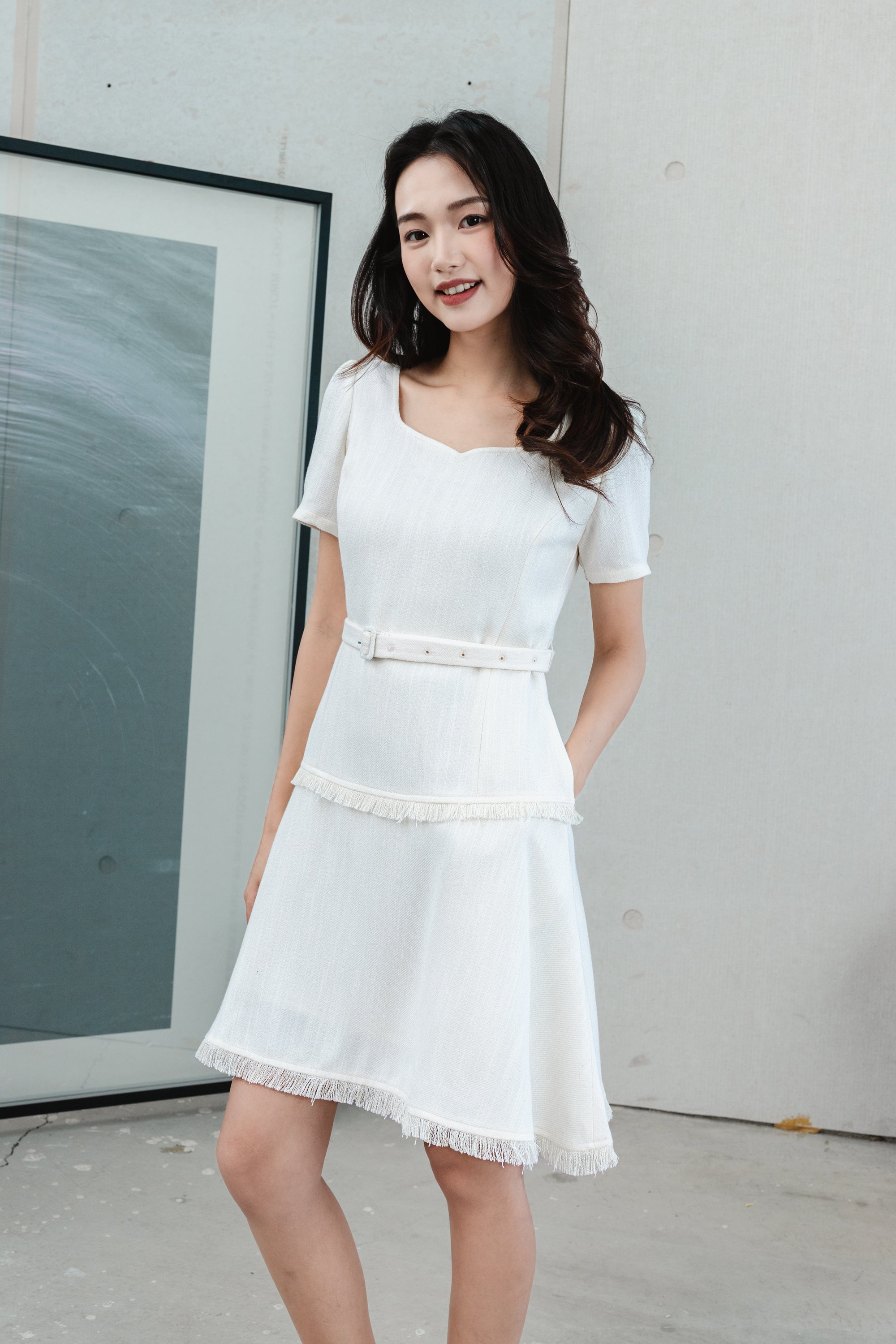 Gaia belted white tweed dress