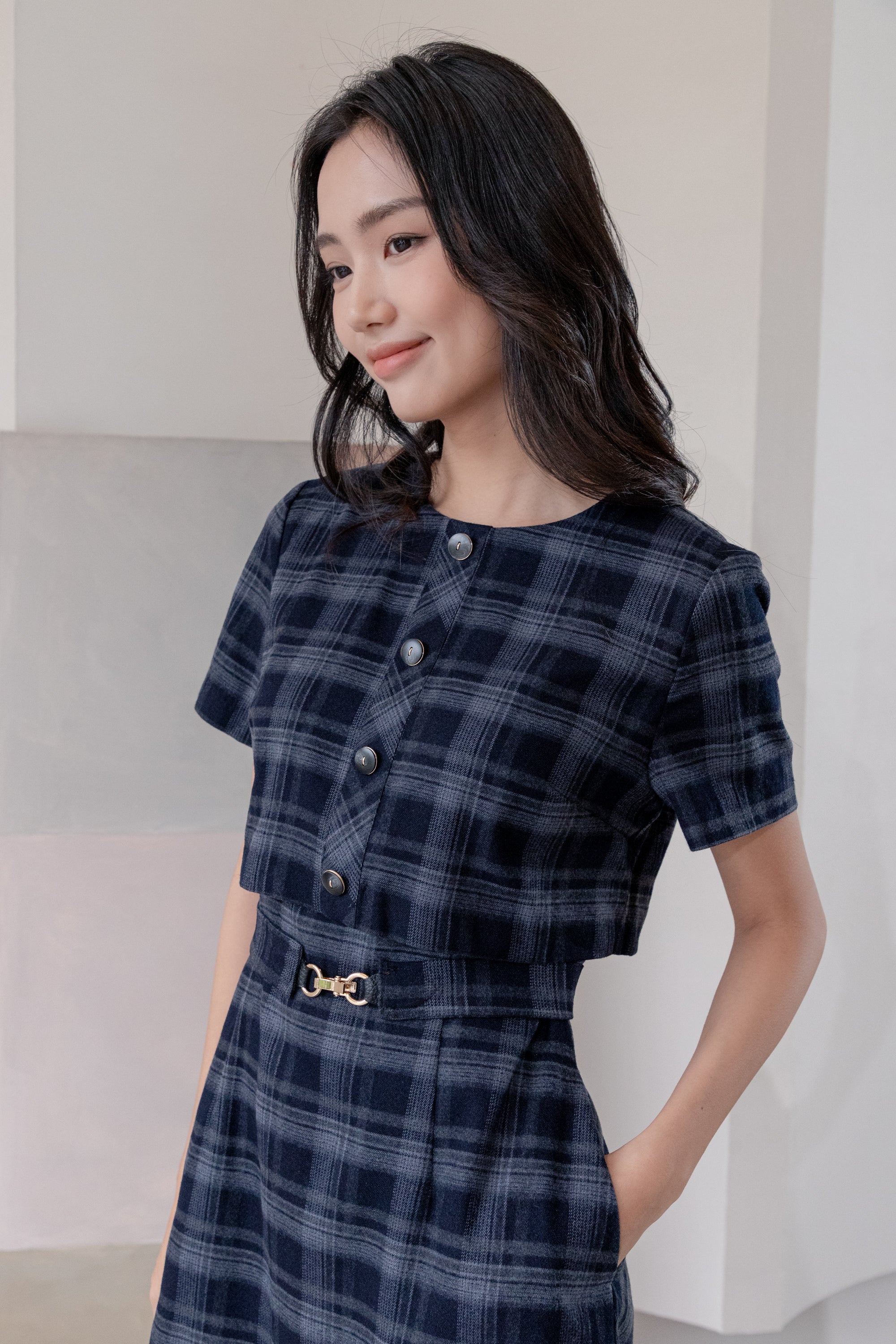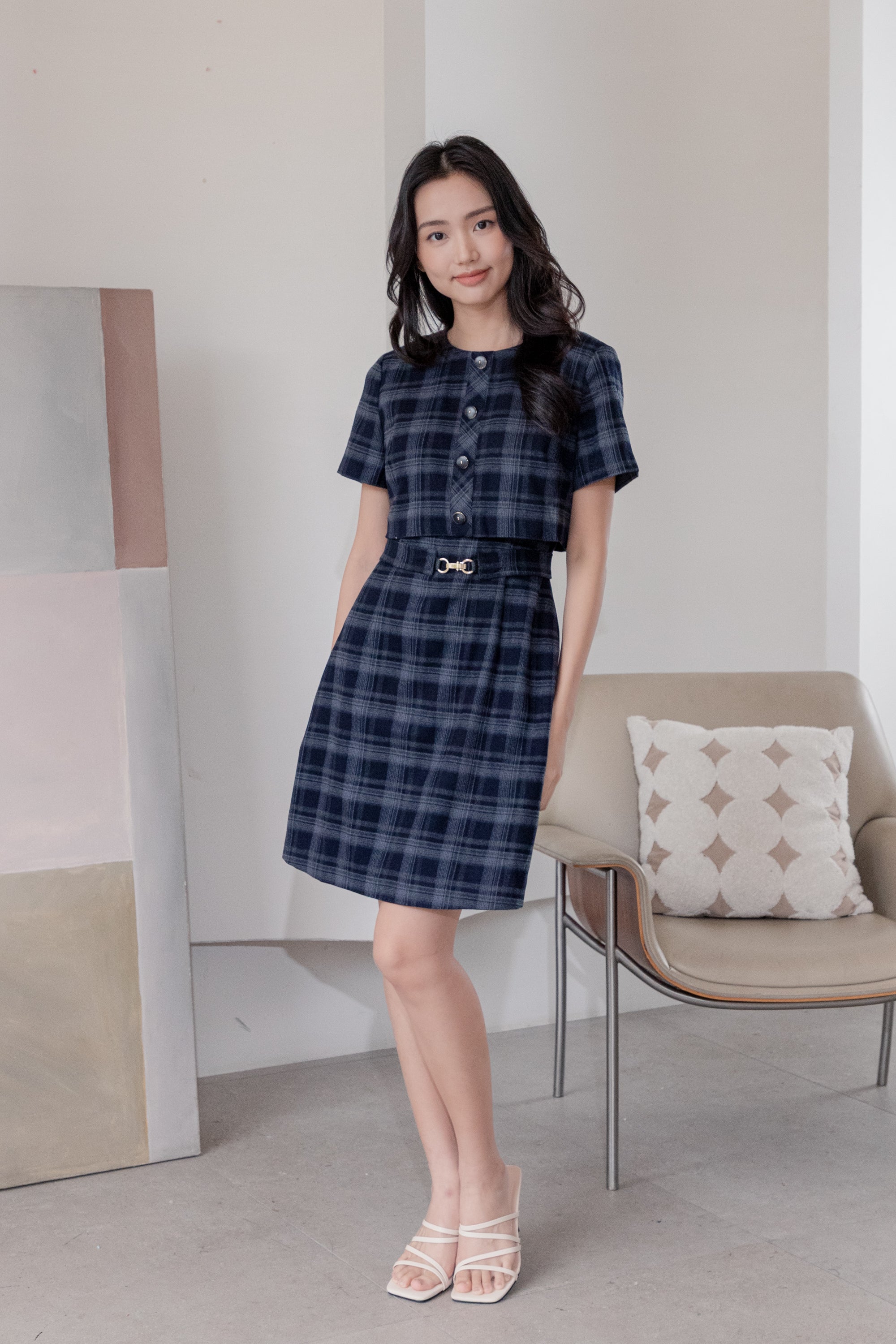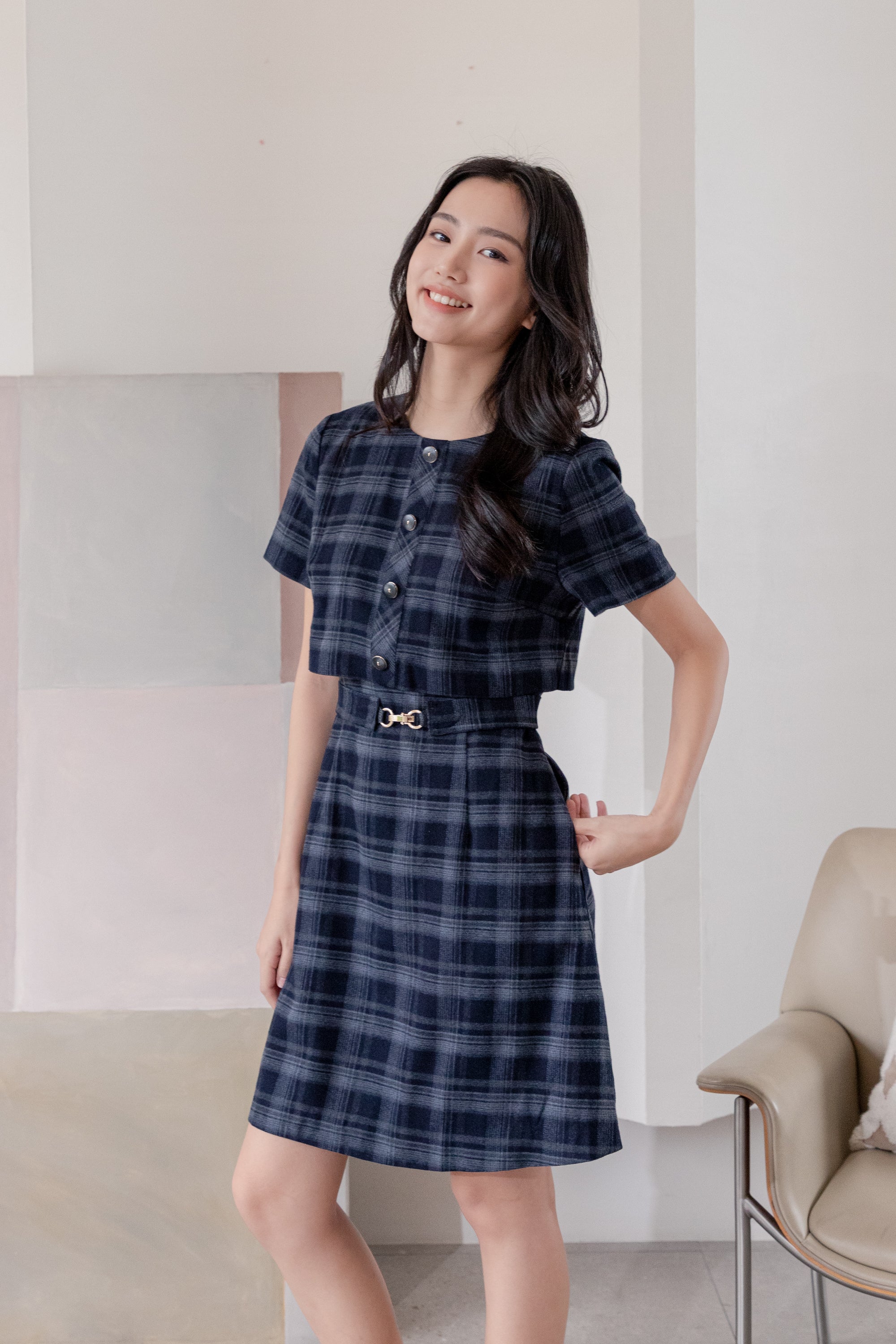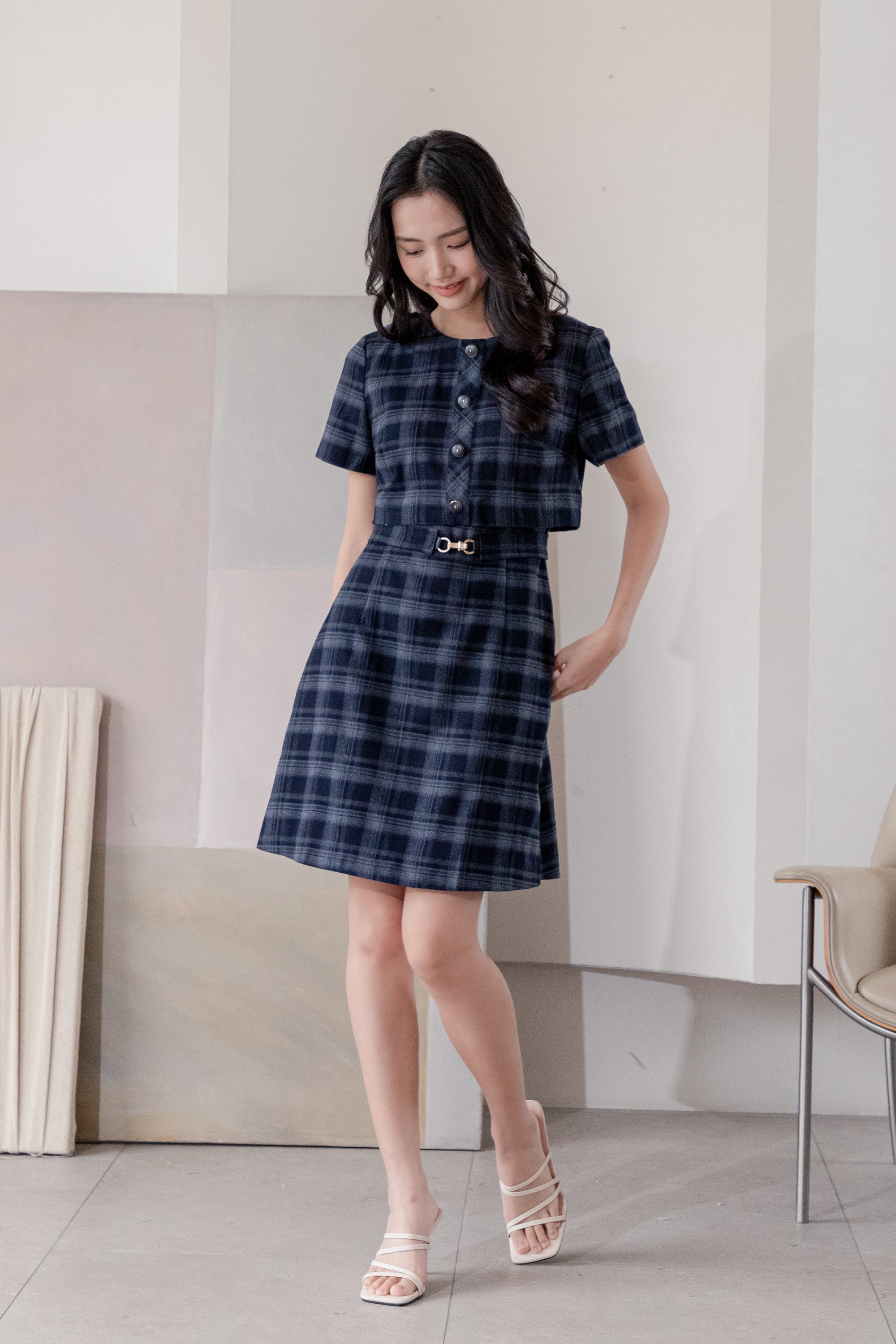 Gavin checked navy midi dress